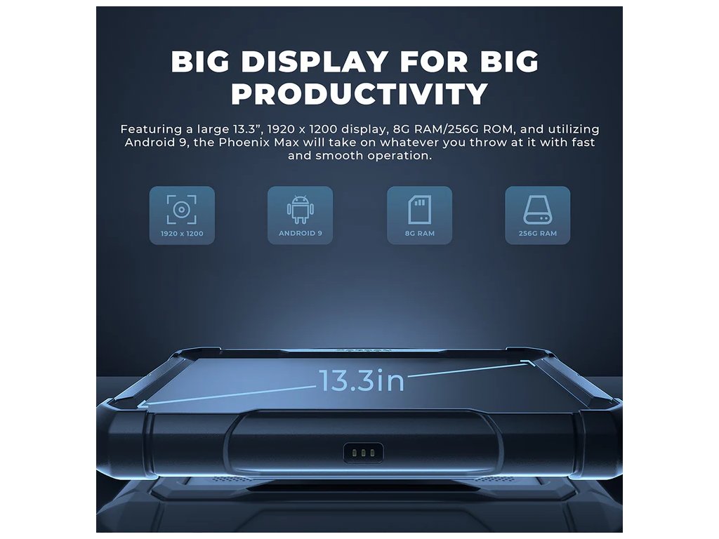 - Díky velkému 13,3” displeji s rozlišením 1920 x 1200, 8G RAM/256G ROM a využívajícím Android 9 zvládne Phoenix Max vše, co na něj postavíte, s rychlým a plynulým provozem.
