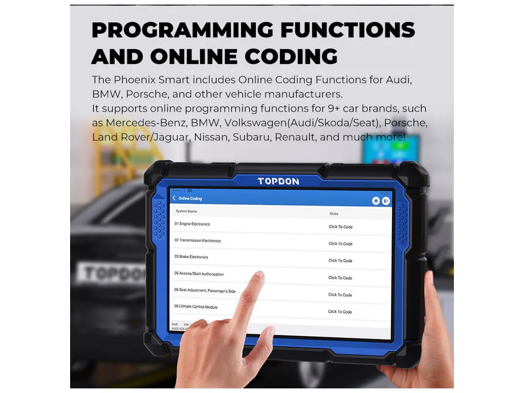 - Phoenix Smart obsahuje funkce online kódování pro Audi, BMW, Porsche a další výrobce vozidel.
