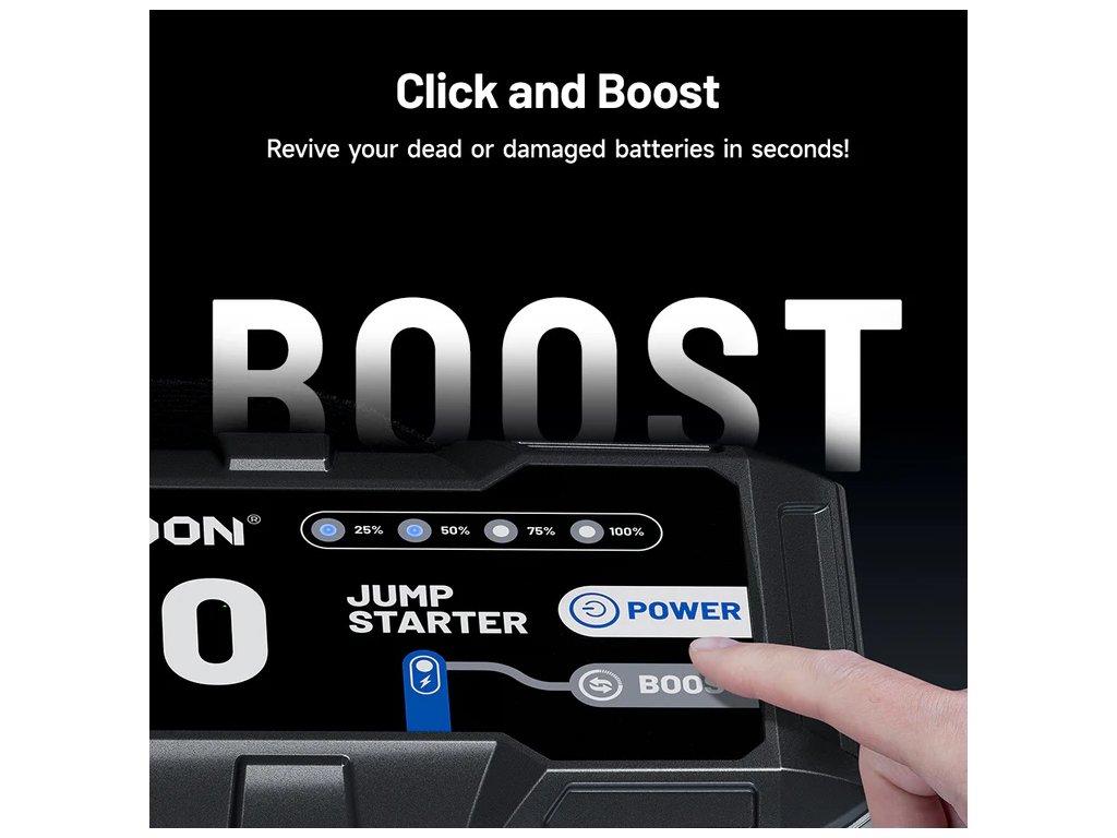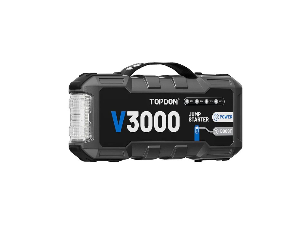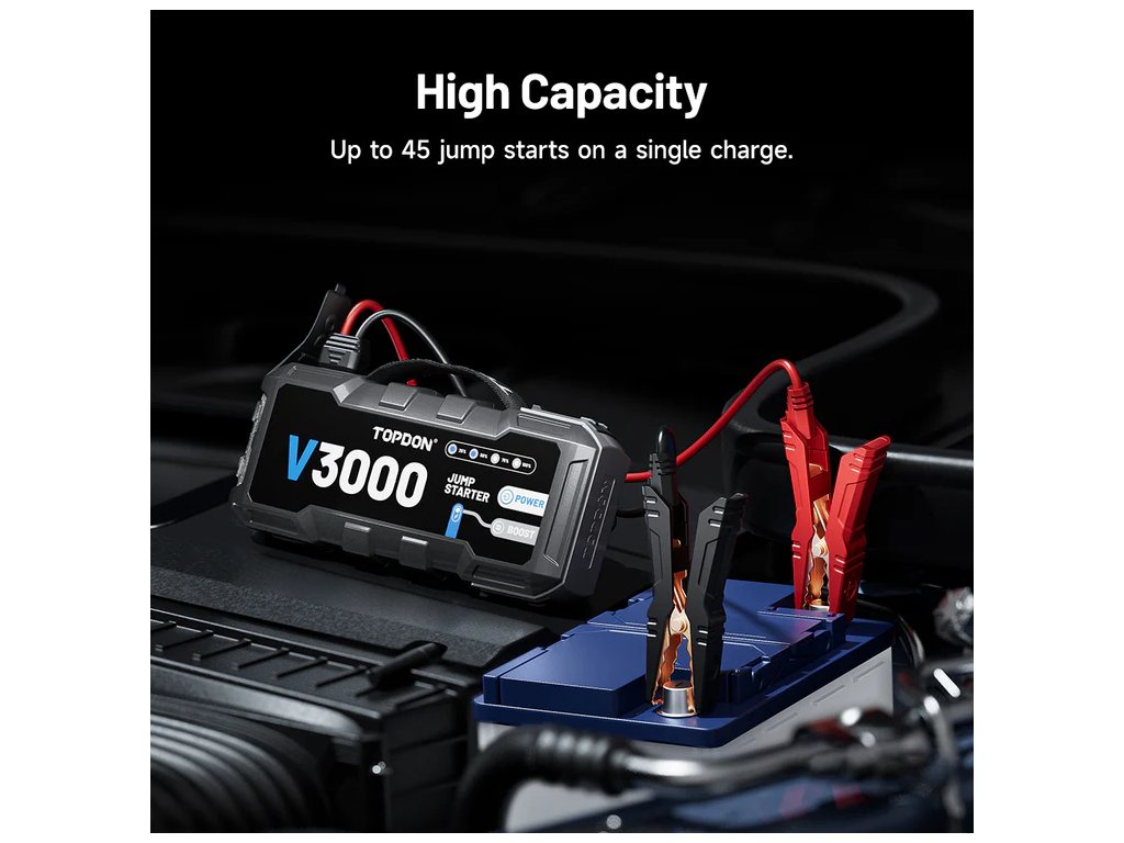 - Vybaveno špičkovým proudem 3000 A a trvalým proudem 750 A, TOPDON V3000 dokáže oživit vybitou baterii během několika sekund. Ať už se jedná o traktor, SUV nebo běžný osobní automobil, tento vysoce kapacitní startovací booster poskytne až 45 startů na jedno nabití. Výkonná lithium-iontová baterie zajišťuje delší výdrž a rychlejší dobíjení.