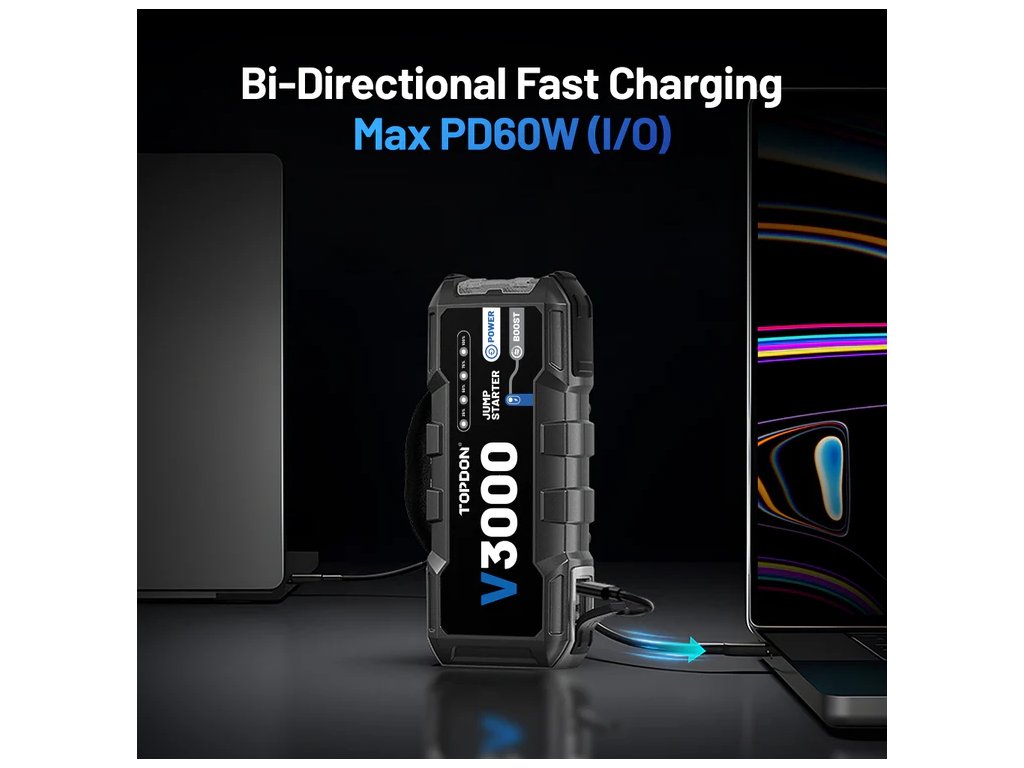 - Více než jen startovací zařízení, V3000 slouží také jako multifunkční přenosná powerbanka. Díky USB Quick Charge 3.0 a rychlému 60W nabíjecímu portu Type-C dokáže rychle nabíjet chytré telefony, tablety, notebooky a další zařízení. Výstup 12V/10A DC navíc podporuje příslušenství jako vzduchové kompresory, nafukovače pneumatik a přenosné ledničky, což z něj činí skutečný nouzový zdroj energie pro automobil.