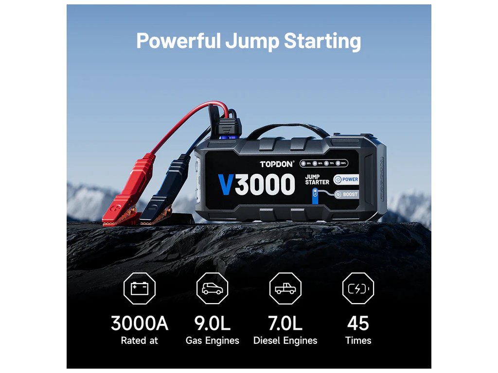 V3000 je výkonný startér s maximálním proudem 3000 ampérů. Je navržen tak, aby spolehlivě nastartoval 12V vozidla, včetně osobních automobilů, SUV, nákladních vozů, pickupů a obytných vozů s motory až do 9,0 l benzínu a 7,0 l nafty. Ať už jste začínající řidič, senior, víkendový dobrodruh nebo zkušený profesionál, V3000 vám poskytne výkon, všestrannost a spolehlivost, na kterou se můžete spolehnout.